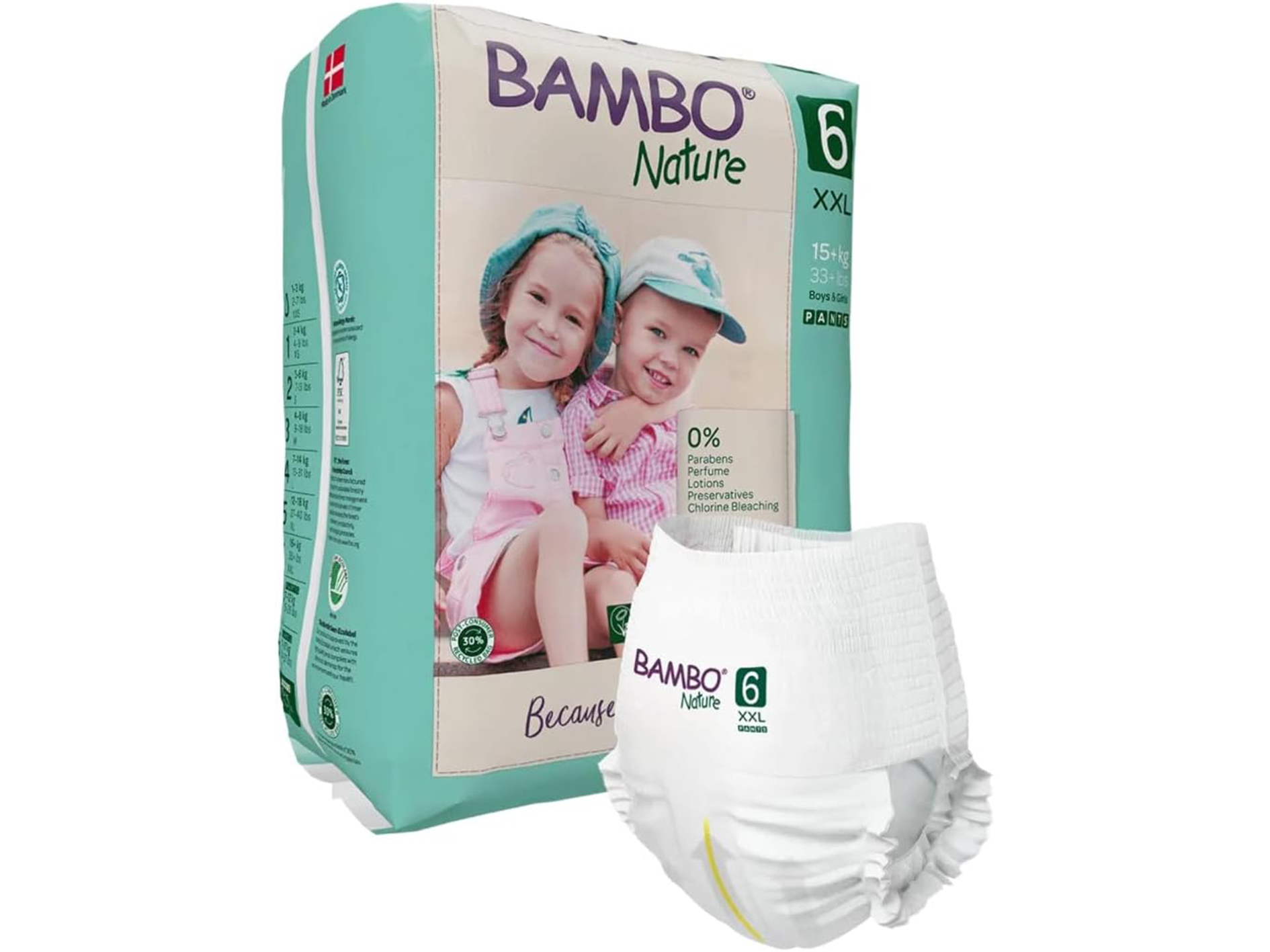 Is your child ready to start potty training? Bambo Nature Disposable pants can help your child make a comfortable transition from baby nappies to no nappies at their own pace. The pants are thin and easy for little hands to pull up and down, even when they're in a hurry. Pull them on and off just like usual underwear. Bambo Nature Disposable nappies are soft, comfortable, and keep even the most sensitive skin dry. The Nordic Ecolabel guarantees you a nappy free of harmful chemicals, colours, chlorine, perfume, and all known allergens. A unique three-layer design and super-absorbent core hold up to multiple wettings-even overnight. The convenient wetness indicator changes colour and makes it easy to see when a change is needed.